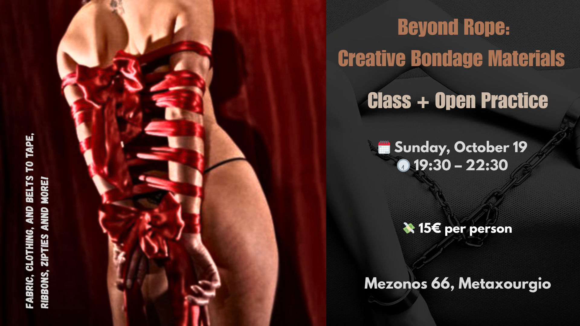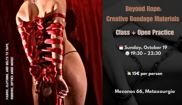 Σε αυτό το ιδιαίτερο βραδινό μάθημα και ανοιχτή πρακτική, θα εξερευνήσουμε πώς μπορούμε να δημιουργήσουμε όμορφο, ασφαλές και αποτελεσματικό δέσιμο χρησιμοποιώντας εναλλακτικά υλικά — ύφασμα, ρούχα, ζώνες, αλυσίδες, ταινίες, κορδέλες, δεματικά και πολλά ακόμη!